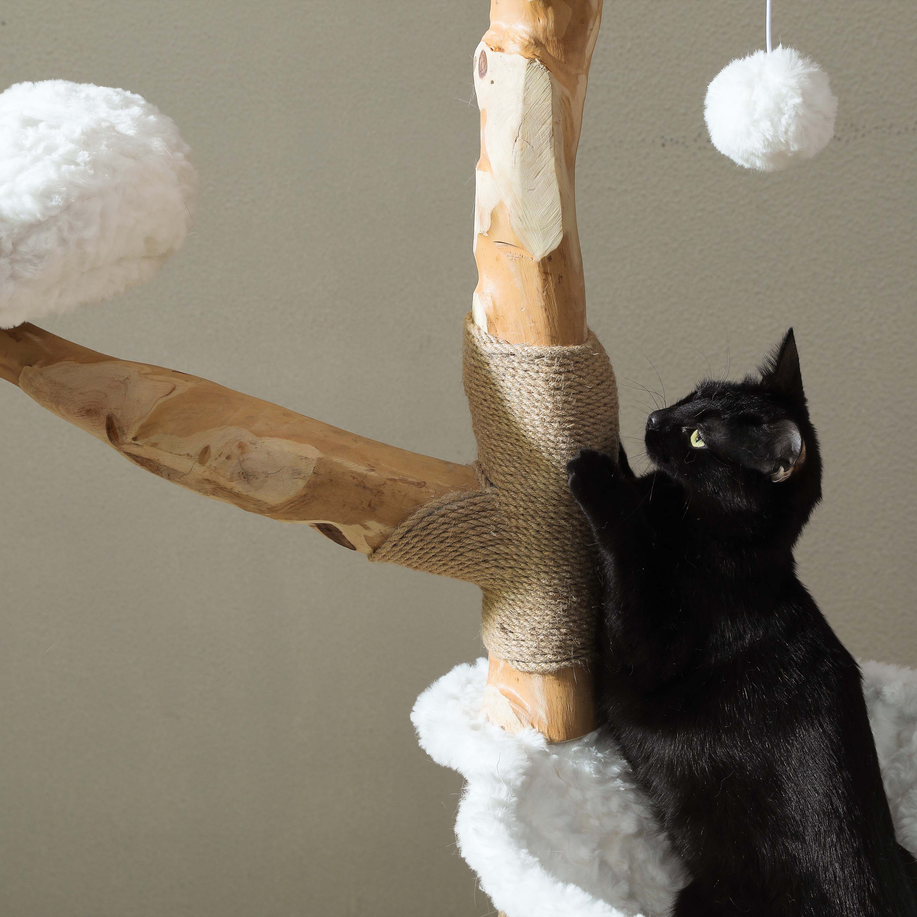 Auf dem Holzkratzbaum befindet sich ein weich gepolsterter Korb, in dem Ihre Katze ruhen kann. Dank der robusten Holzstangen und eines stabilen Standfußes bleibt dieser Holzkratzbaum für Katzen an seinem Platz, auch wenn Ihre Katze darauf springt. Die Kratzfläche ist mit strapazierfähigem Sisal umwickelt, sodass Ihre Katze ihre Krallen schärfen kann, ohne Ihre Möbel zu beschädigen. Dieser Kratzbaumstamm kann auch als kleine Katzenkletterwand dienen und Ihrer Katze eine höhere Perspektive im Haus bieten.