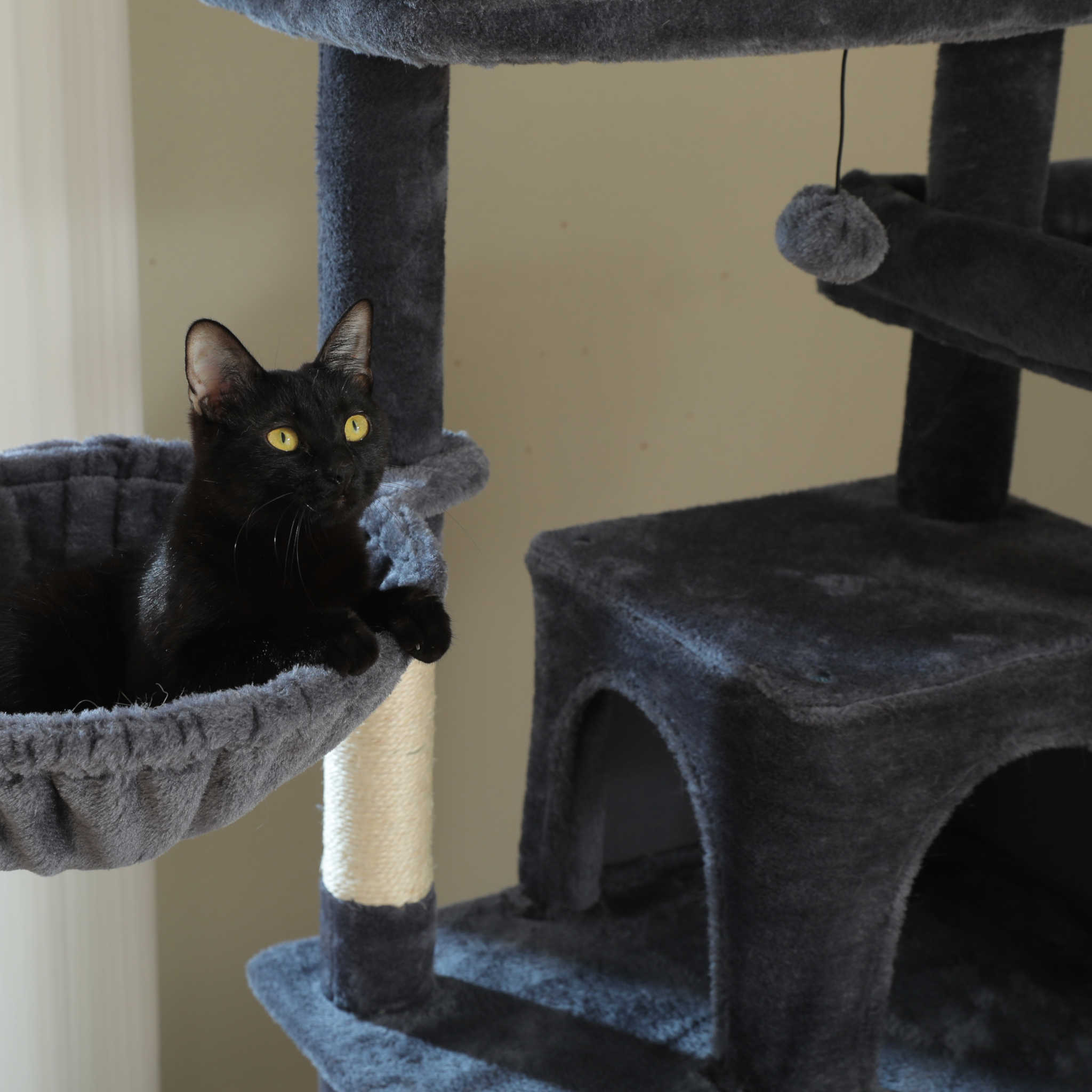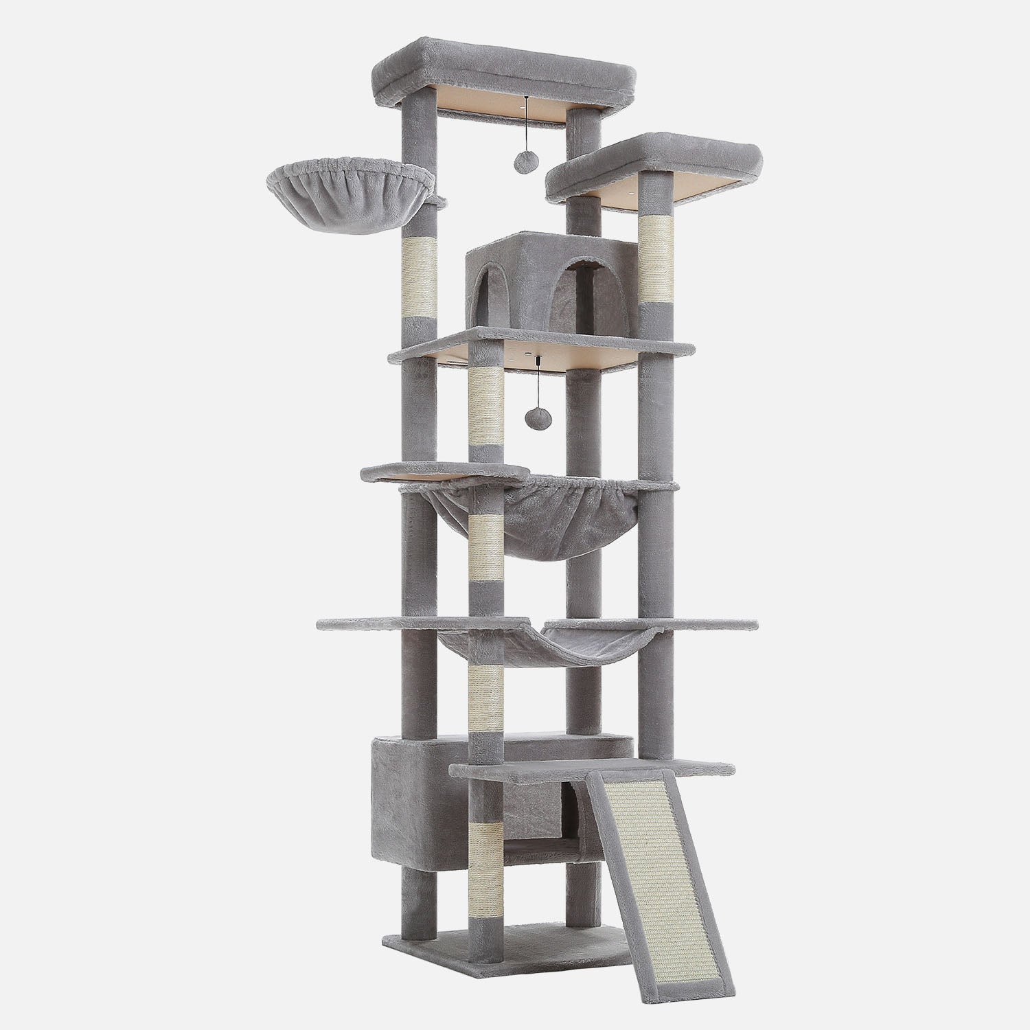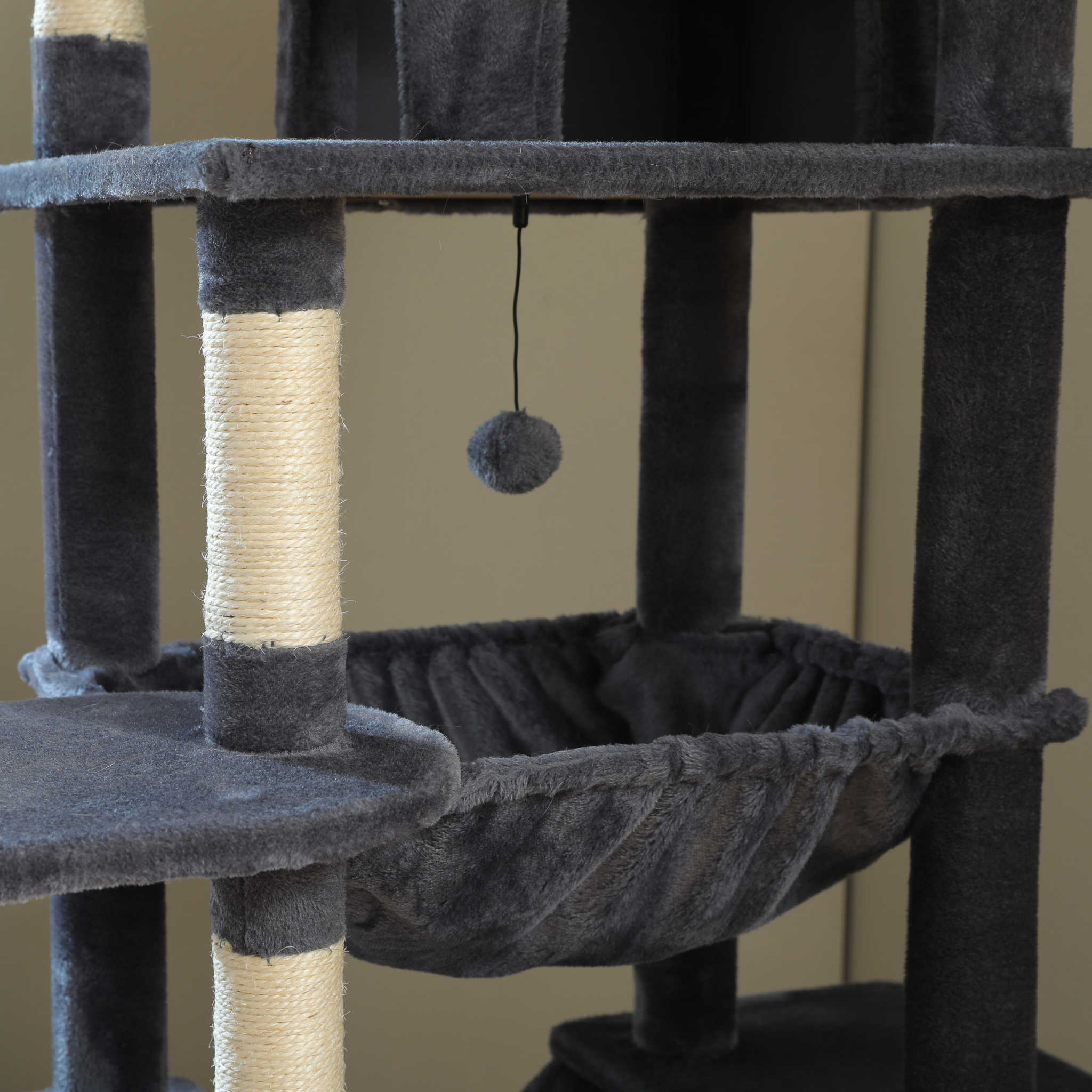 Dankzij de verzwaarde bodemplaat, versterkte sisal palen en slijtvast pluche is deze XXL krabpaal ontworpen voor intensief dagelijks gebruik. De solide constructie zorgt voor maximale stabiliteit, ook wanneer meerdere grote katten tegelijk spelen of klimmen.