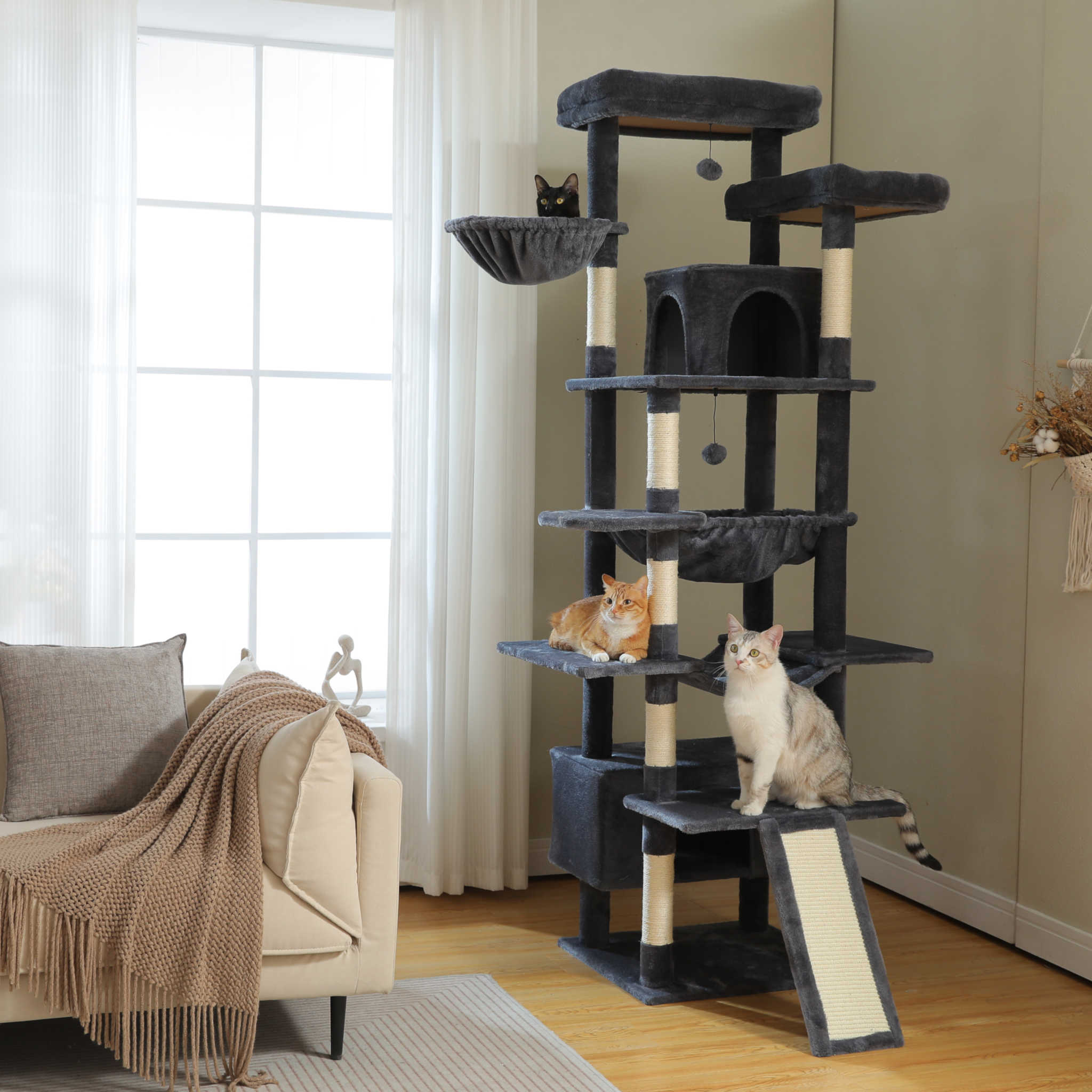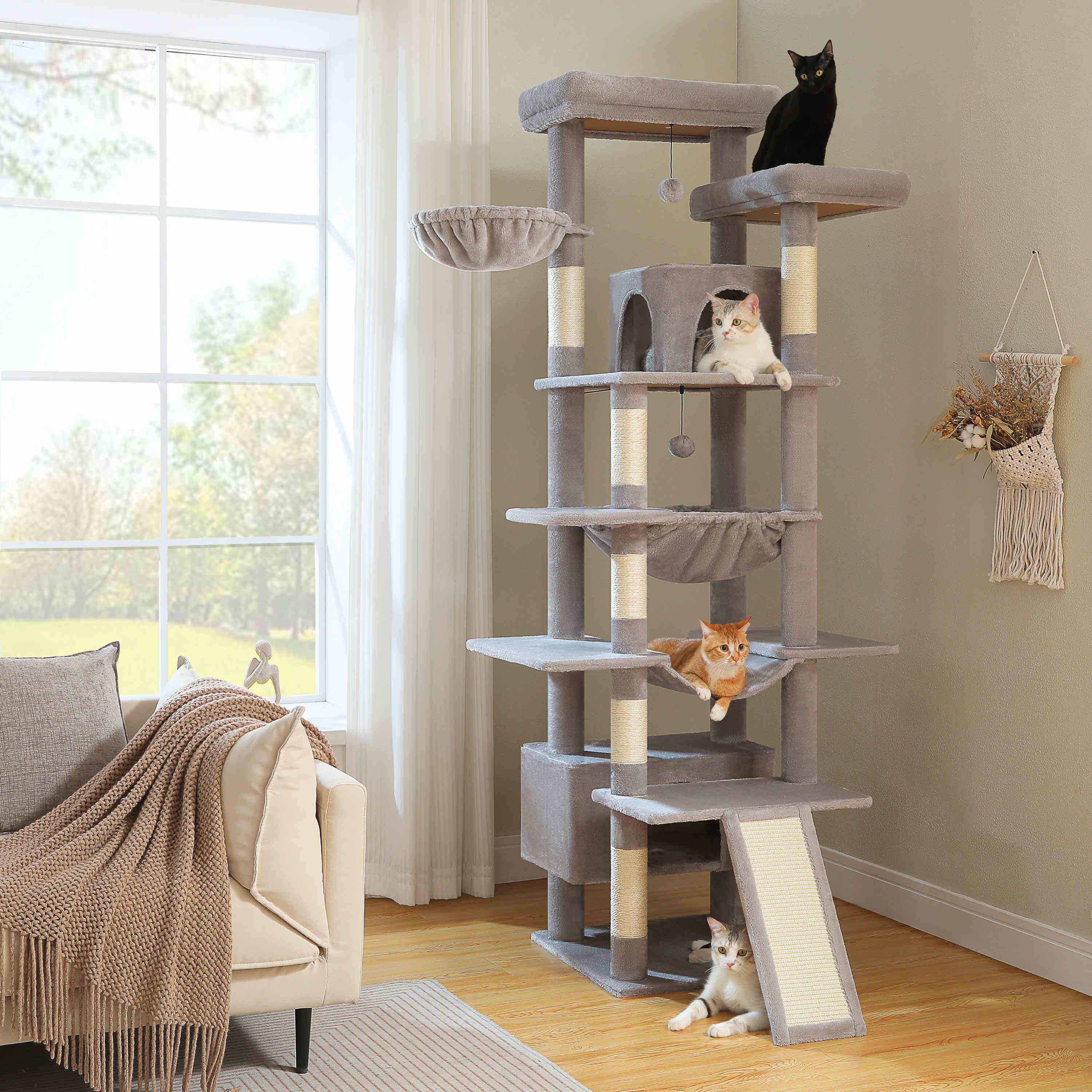 De CatsKingdom XXL is uitgerust met extra dikke sisal krabpalen, ruime plateaus en royale ligplekken, waardoor hij ideaal is voor grote kattenrassen. Elk niveau creëert een eigen plek om te krabben, ontspannen of de omgeving te observeren.