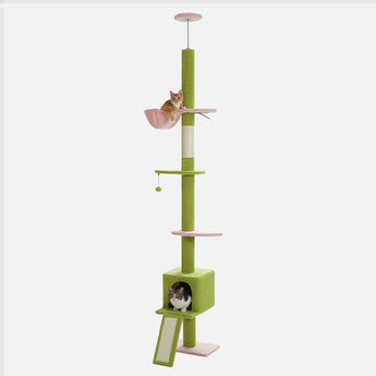 Deze krabpaal biedt een hangmat, een kattenhok en drie platforms, waardoor uw kat een flexibele en ruime plek heeft om te klimmen, verkennen en rusten. De krabpaal is eenvoudig te bevestigen tussen vloer en plafond, wat zorgt voor een veilige en stabiele omgeving voor uw katten.