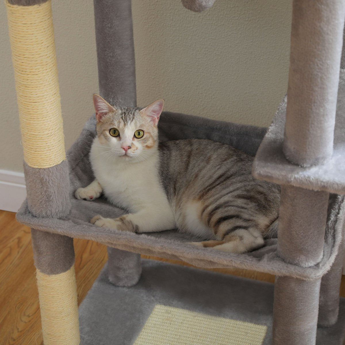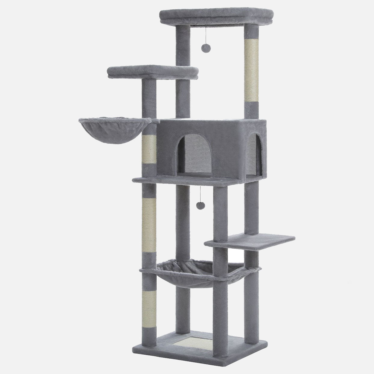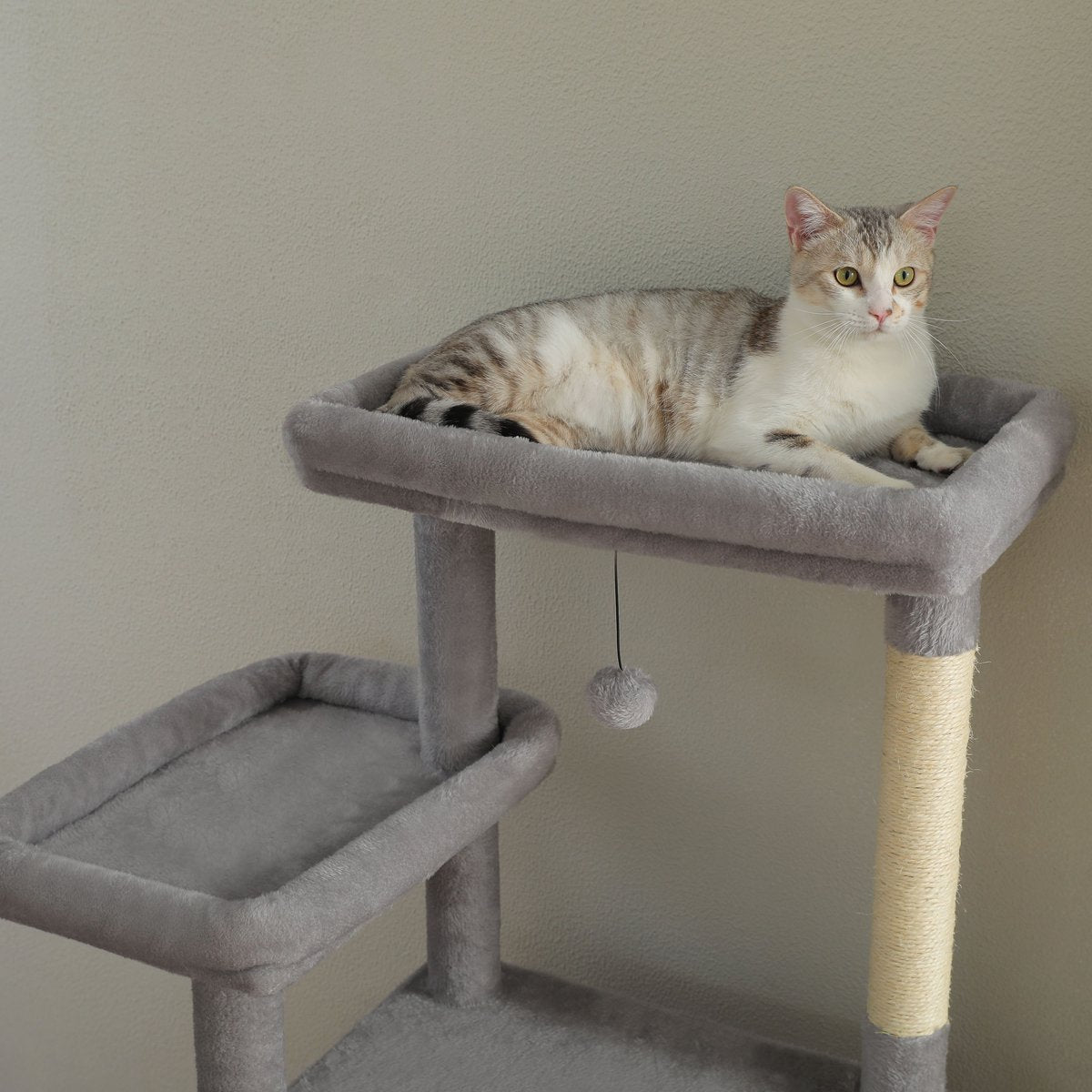 De grijze uitvoering van de CatsKingdom krabpaal is afgewerkt met zacht maar slijtvast pluche in een neutrale kleur die past in elk interieur. De stevige bodemplaten en extra dikke sisalpalen zorgen voor langdurige stabiliteit, ook bij zware katten of intensief krabgedrag.