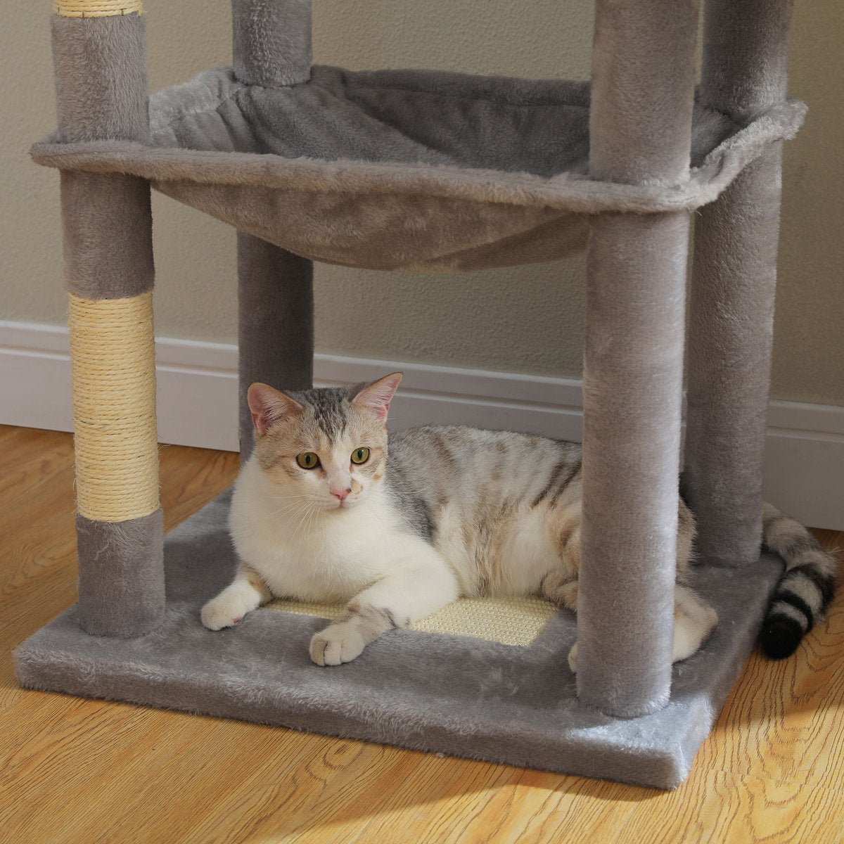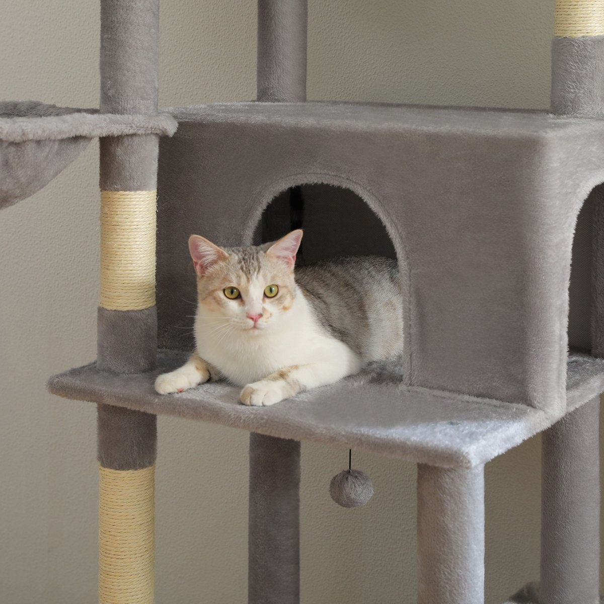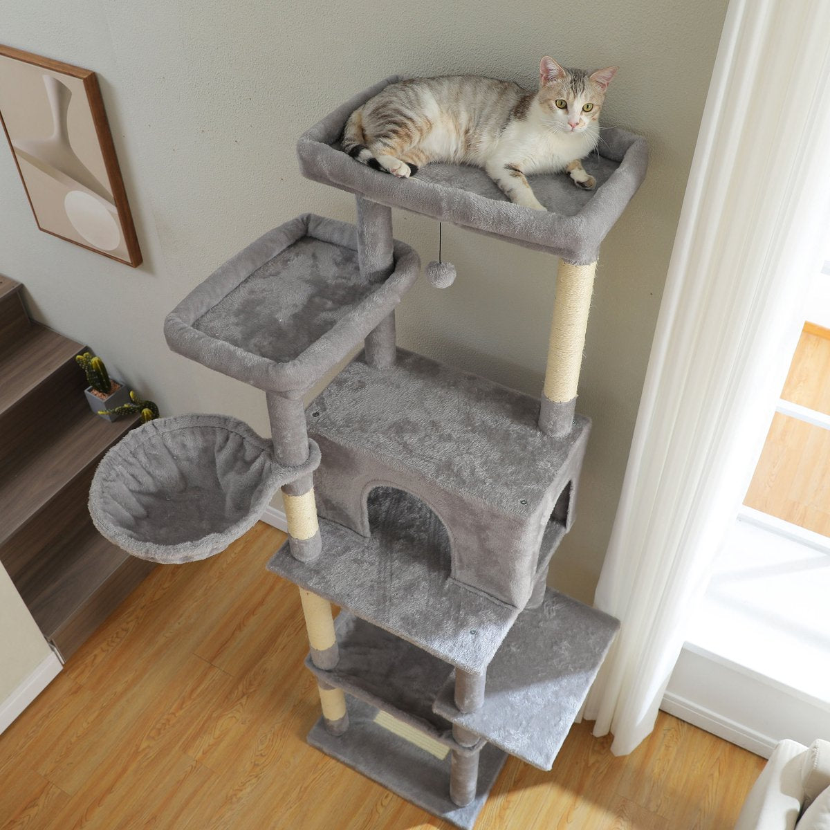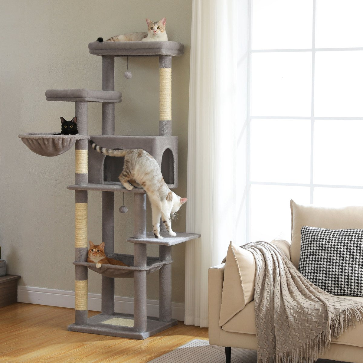 De grijze uitvoering van de CatsKingdom krabpaal is afgewerkt met zacht maar slijtvast pluche in een neutrale kleur die past in elk interieur. De stevige bodemplaten en extra dikke sisalpalen zorgen voor langdurige stabiliteit, ook bij zware katten of intensief krabgedrag.