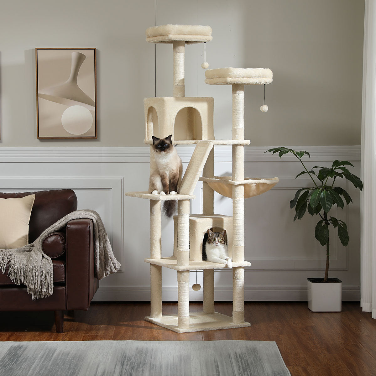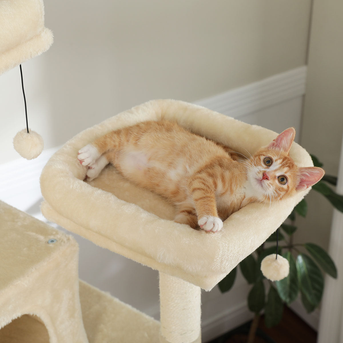 - Veelzijdig Ontwerp: Met zes verschillende functies biedt deze krabpaal alles wat je kat nodig heeft. Van meerdere krabstammen om nagels te scherpen, tot verhoogde platforms voor klimplezier, een zachte hangmat voor een ontspannen dutje, en een knus huisje waar je kat zich kan terugtrekken voor wat privacy.